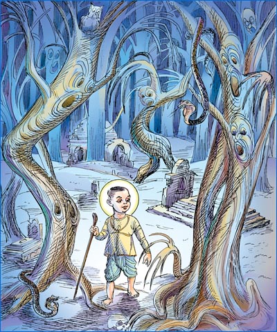 He grabbed a small stick and left for the farm. After crossing the outskirts of the town, Dungar Bhakta took a road winding through the dark jungle. Strange voices echoed, birds noisily fluttered their wings, foxes cried, and little rabbits scrambled from here to there - anyone would be frightened. But not Dungar. Chanting “Swaminarayan, Swaminarayan,” Dungar fearlessly reached the farm. Dhoribhai was surprised to see Dungar. He asked, “Dungar! Were you not afraid to come alone at night?”