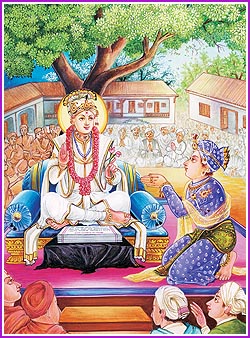 my tests.” He then thought of 4 wishes: With these thoughts churning his mind, he galloped off to Gadhada. Along the way, his mind started getting calmer and calmer. For a few moments this made Ladudan shudder, “Could this be because he is God? No, no.” In Gadhada, he trotted into Abhal Khachar’s darbar. On his left he saw a large neem tree. People were sitting underneath its shade. There were saffron robed sadhus as well. He suddenly felt drawn towards the tree. As he came closer, his eyes fell on a person dressed in white, seated on a high seat. He felt a wave of soothing peace roll over him. He did not understand what was happening to him. He did not know that he had got off his horse and was walking towards the magnificent figure in white, with a rose garland around his neck ! He saw the Bhagvat on a black woollen cloth ! Just then he heard a voice. A friendly voice. “Welcome Ladudanji! Welcome!” Ladudan nearly fainted. Three wishes fulfilled! “Who is he? Is Swaminarayan really God?” His heart thumped wildly against his chest. By now Ladudan had reached Shriji Maharaj. Instantly he knelt down at Maharaj’s lotus-feet. As his head touched the feet, he saw the 16 signs on the tender soles of Maharaj! His fourth wish was fulfilled! That did it! His ego of being the best poet crambled. His heart was humbled. “O Bhagwan! Please forgive me. My ego prevented me from believing you as God. Please forgive me...” Tears filled Ladudan’s eyes. Shriji Maharaj placed His hands on Ladudan’s head and blessed him. This divine touch transformed Ladudan. His heart was now completely drenched with bhakti for Shriji Maharaj. Being an extempore poet, he instantly composed the famous kirtan. “Ajni ghadi re, dhanya ajni ghadi, Shriji Maharaj then gave Ladudan |