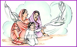 So to Ghanshyam, His brother’s wife was ‘bhabhi’.) One day Ghanshyam went to Suvasinibhabhi and complained, “Bhabhi, one of my molar teeth hurts a lot. I can’t even chew chapattis. Please make me some shiro.” Suvasinibhabhi willingly agreed. The shiro was ready in no time. Suvasinibhabhi called everyone to eat. She gave Dharmadev, Rampratapbhai and young Iccharam chapattis and gave Ghanshyam the shiro that she had specially perpared for Him. Ghanshyam shared some of His shiro with His younger brother Iccharam. Having barely eaten even two morsels of shiro, Ghanshyam got up, washed His hands and went outside. Seeing this, Suvasinibhabhi came out after Him. “What’s wrong? Is your tooth paining you a lot?” she enquired. “Yes, it hurts a lot. It is loose and wobbling a lot too. Please pull it out,” said Ghanshyam, opening His mouth for His bhabhi. Suvasinibhabhi checked the tooth. It was very loose; she had it out within no time. Just then, Ghanshyam pointed out a second tooth, “This one hurts too. It’s a bit loose as well; please pull it out.” Suvasinibhabhi complied. But then Ghanshyam pointed to a third, then a fourth....With His godly powers, Ghanshyam made all of His teeth loose and in turn had them pulled out one by one. Before she knew it, Suvasinibhabhi had pulled put all of Ghanshyam’s teeth. Seeing Ghanshyam’s toothless mouth, Suvasinibhabhi became worried and frightened. She shouted to Bhaktimata, who then came quickly. Suvasinibhabhi explained, “Ghanshyam was complaining that His tooth was paining and loose, but in doing so He has had all His teeth pulled out. He won’t be able to eat anything now!” Seeing the collection of teeth that had been pulled out, Bhaktimata became worried too. Fearing the worst, she requested Ghanshyam to open His mouth. Ghanshyam opened His mouth, but to Bhaktimata’s and Suvasinibhabhi’s astonishment, Ghanshyam had a completely new set of 32 teeth! They were amazed beyond belief. Ghanshyam immediately picked up all the teeth that had been pulled out, and held them in His fist. Suvasinibhabhi asked Him to let her see them. Ghanshyam opened His fist, and to everyone’s astonishment, there were pearls instead of teeth! Ghanshyam lifted His hand high, and divine swans from Maansarovar came flying to Ghanshyam, and, one by one, took a pearl each in their beaks from Ghanshyam’s hand and flew off. Bewildered beyond belief, Bhaktimata and Suvasinibhabhi bowed to Ghanshyam, recognizing Him to be Bhagwan Himself. |